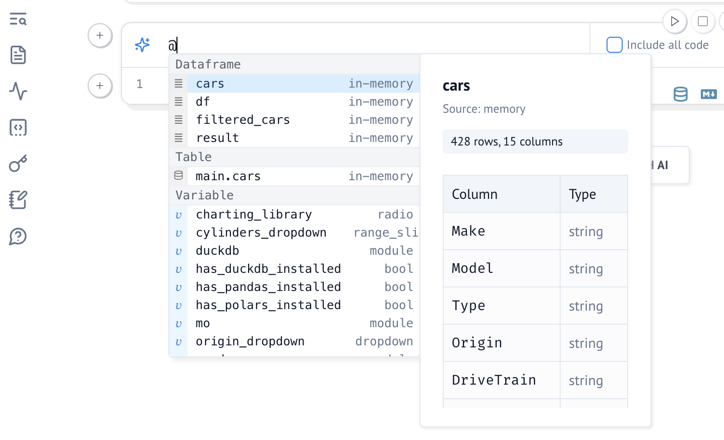 marimo's AI assistant is specialized for working with data: unlike traditional assistants that only have access to the text of your program, marimo's assistant has access to the values of variables in memory, letting it code against your dataframe and database schemas.